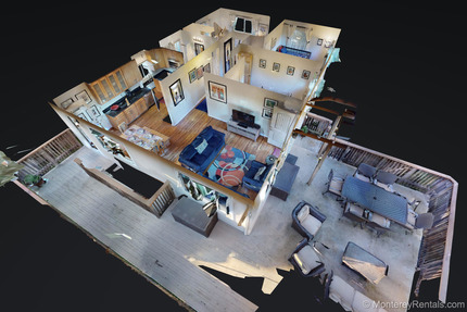 You’ll be spending lots of time outdoors at Bayview Cottage: the spacious deck is like a second living room with all-weather wicker furniture (sofa, chairs, and dining for six). Inside, there’s a large flat screen TV with BluRay DVD player, and a remodeled kitchen with black galaxy granite and stainless appliances, including a five-burner gas range. The master bedroom has a Queen bed and a petite private bath with a stall shower lined with mosaic tile. Two other guest rooms (one Queen, one with twin trundle beds) share a hall bath with a tub/shower. There’s a large (un-fenced) backyard and a two-car garage (with a washer/dryer) downstairs. This quiet neighborhood is just a splash away from Cannery Row (restaurants, shops and the Aquarium—it’s a great central location for enjoying all the delights of the Monterey Peninsula. Monthly rentals only. Up to two dogs accepted with prior screening at https://monterey.petscreening.com less ↑